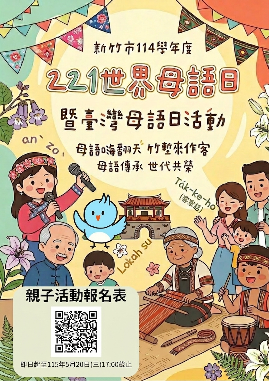 | 主旨: | 本府辦理「新竹市世界母語日暨歡樂臺灣母語博覽會」,邀請貴校共同參與設置闖關攤位並協助周知校內師生、家長踴躍報名,詳如說明,請查照。 |