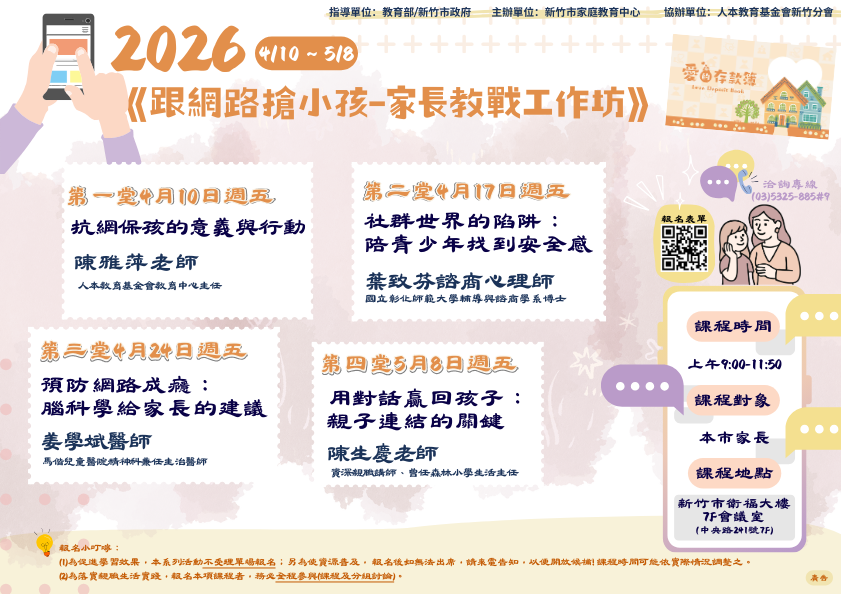 新竹市家庭教育中心舉辦「跟網路搶小孩-家長教戰工作坊」系列,歡迎參加。